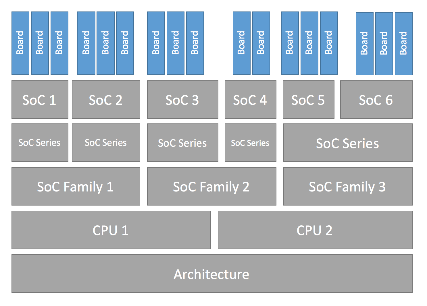 Below are some examples of the hierarchy described in this section, in the form of a board per row with its corresponding hierarchy entries. Notice how the SoC series and SoC family levels are not always used.